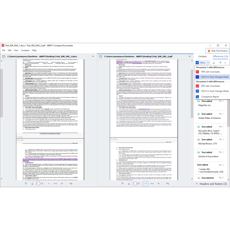 Швидке, точне та просте порівняння документів. Забудьте про стомливе порівняння двох текстових документів вручну. ABBYY FineReader 16 автоматично виявляє різницю між двома версіями документа за лічені секунди. Для цього не потрібно розпізнавати та конвертувати файли, навіть якщо вам потрібно порівняти документи у різних форматах.