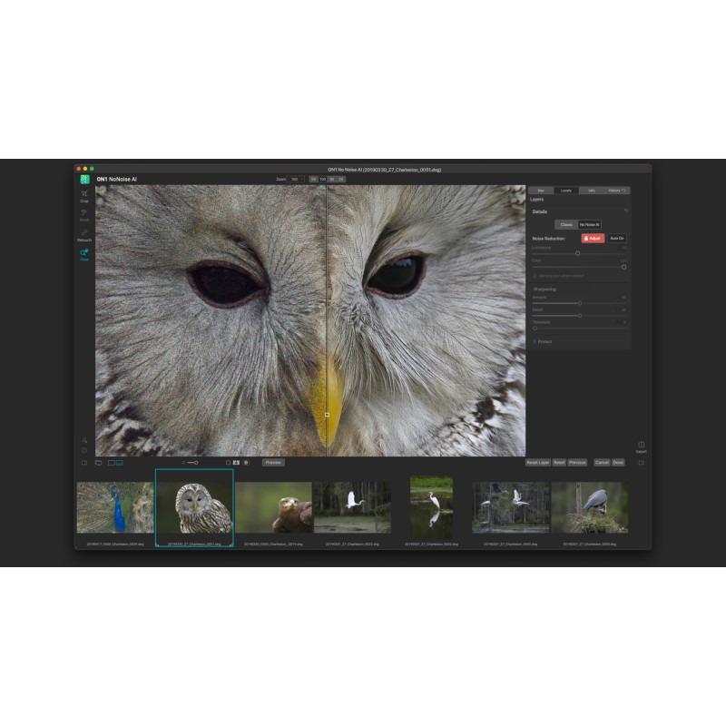 ON1 NoNoise AI використовує нейромережеву технологію для аналізу зображення, виокремлення шуму та видалення його з фотографій. Технологія використовує машинне навчання для навчання програми розпізнаванню шуму та його автоматичної обробки. ON1 NoNoise AI дозволяє:Покращити якість зображень зі зменшенням зернистості та шуму
